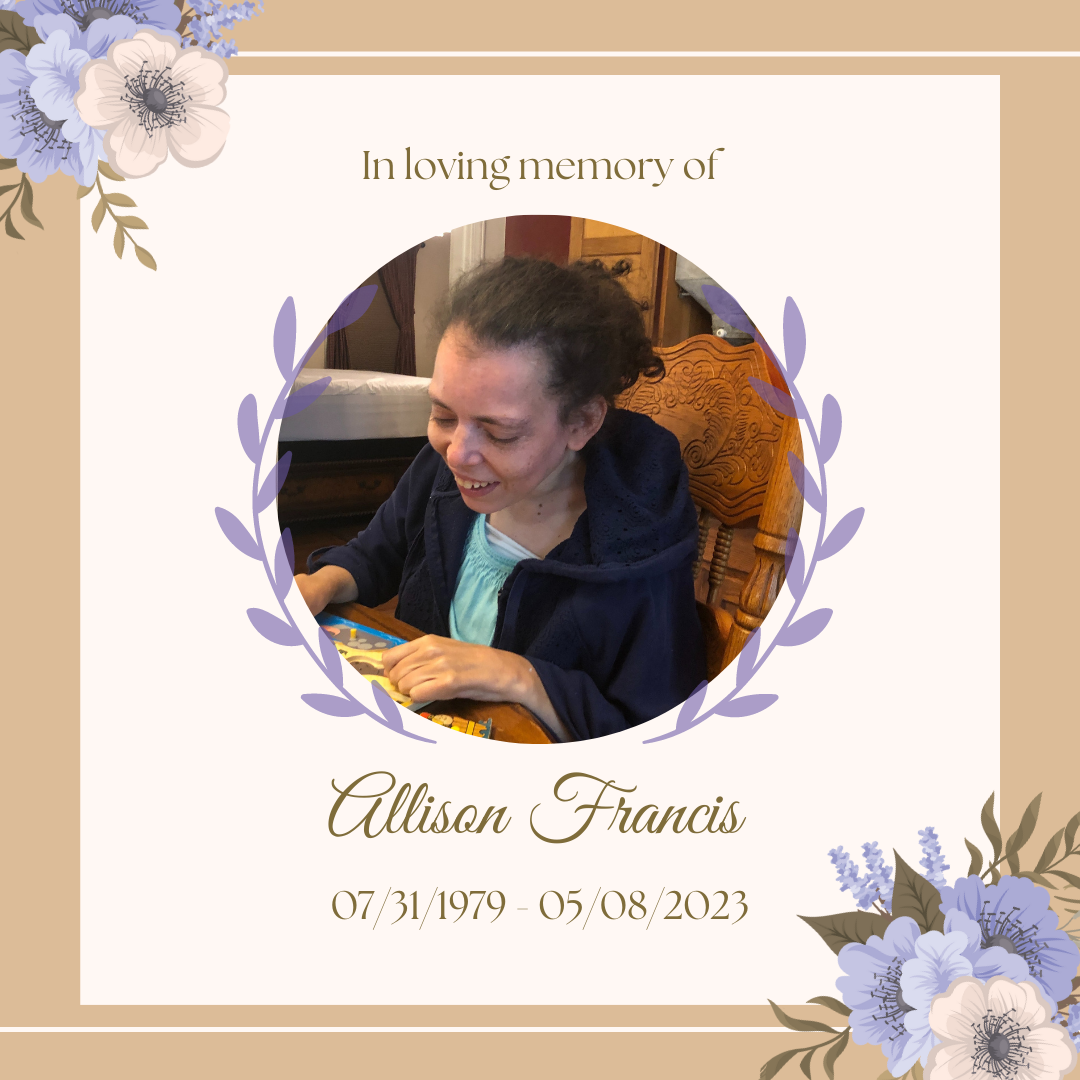We are so very grateful to the sponsored residential home (supported by Wall Residences) of Kristen and Adam, who embraced her and me as members of their family after her seizures and little 80 lb adult body became too much for me to handle. She had a good life. We will always miss her. Soar with the birds, sweet Allison.